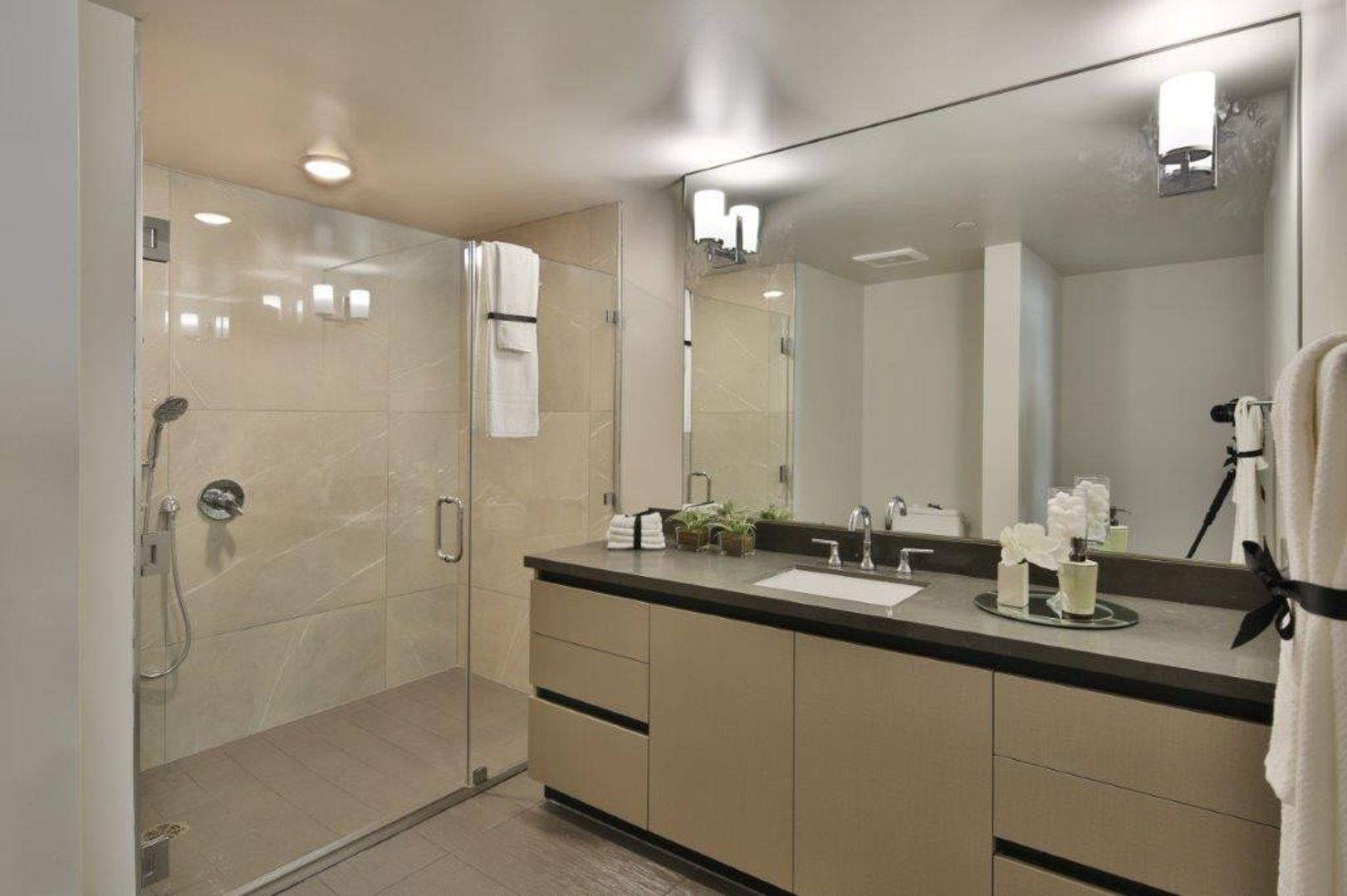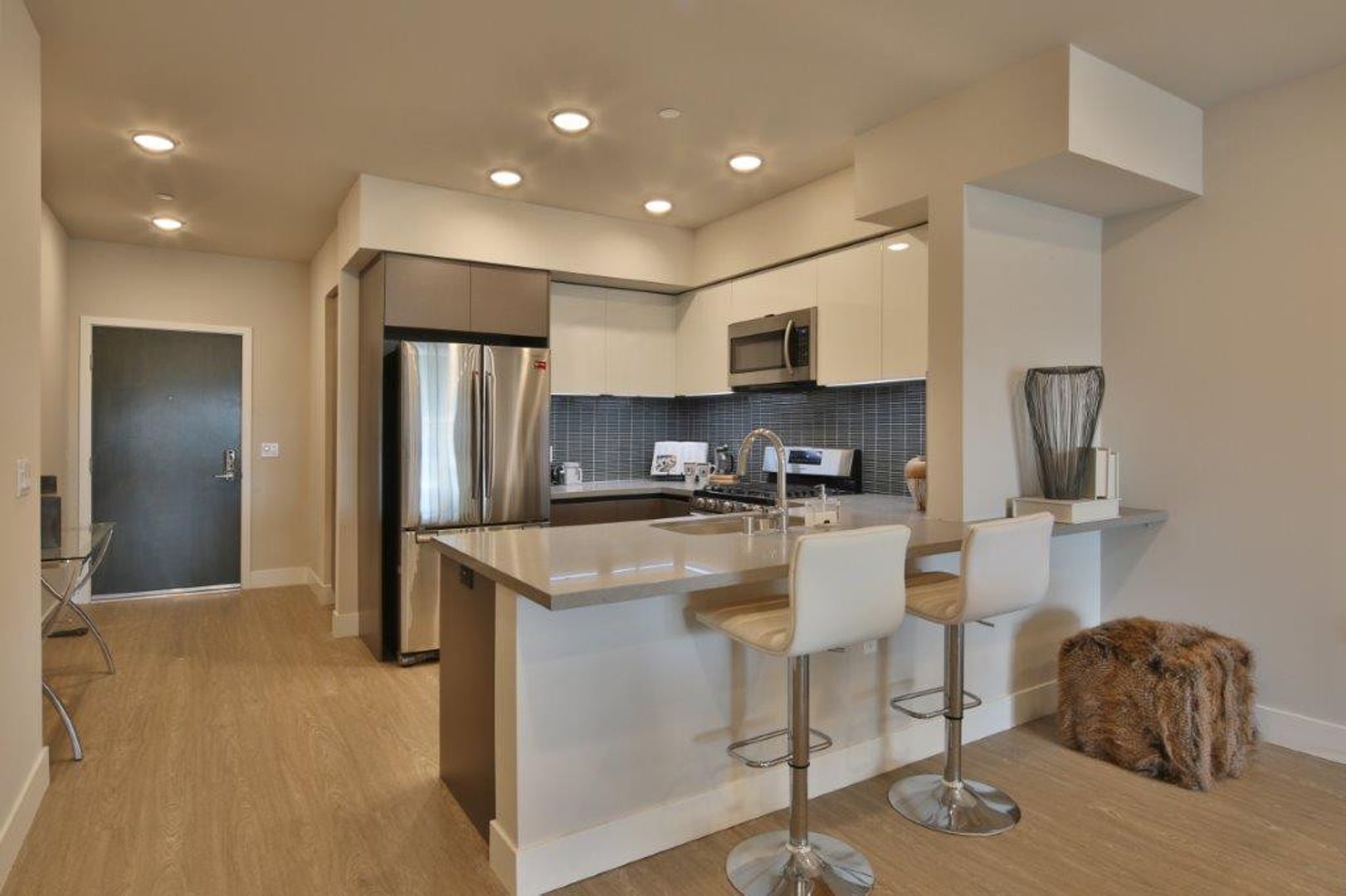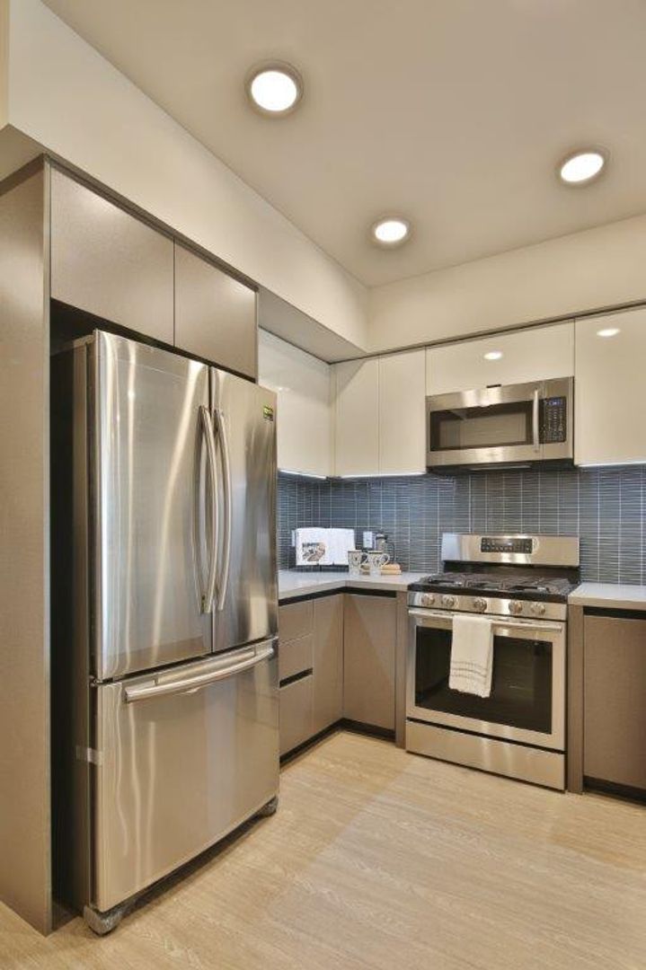 • New stainless steel appliances: Samsung French Door refrigerator with ice maker, gas stove/range, built-in microwave, dishwasher, washer/dryer in unit